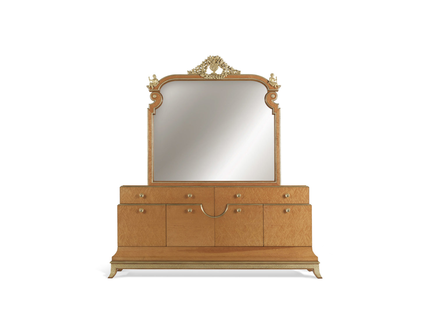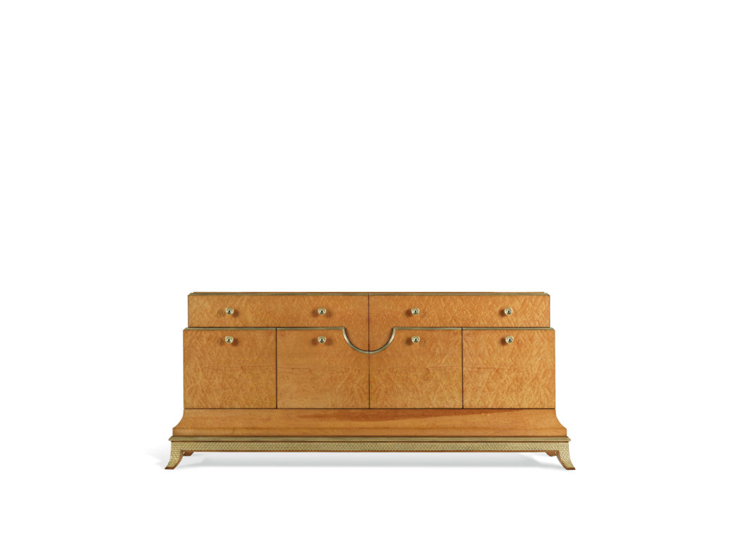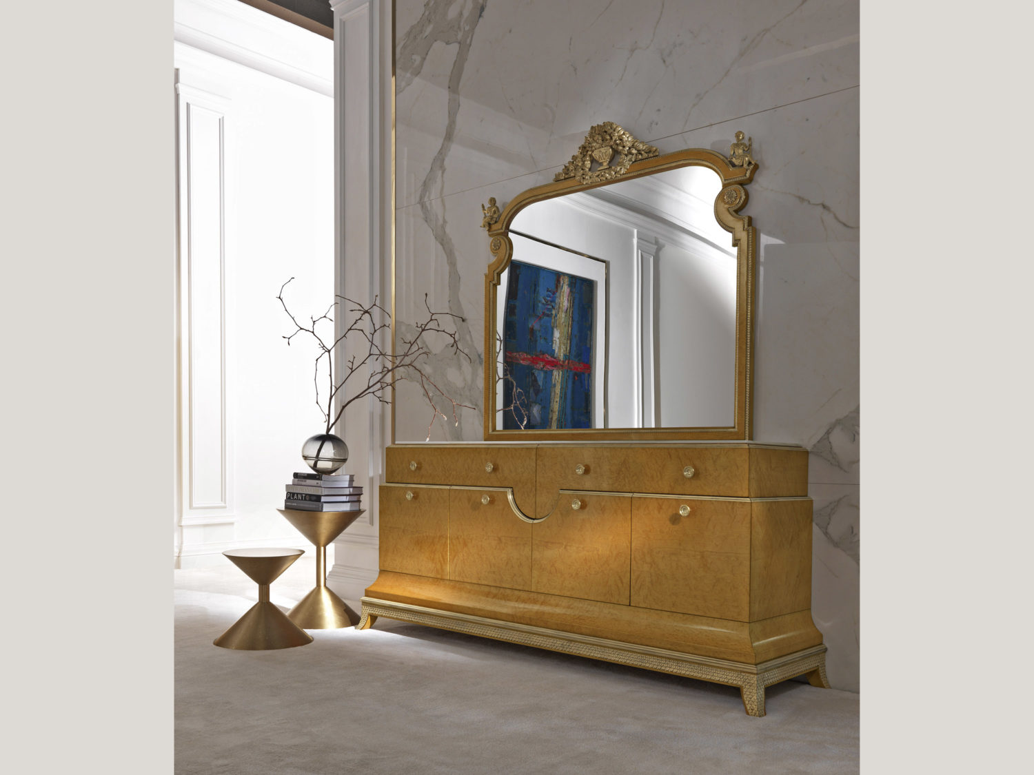 餐具柜结构采用多层可加工的鸟眼枫木,具有光泽的表面处理。细节与古董金饰面。顶部是白色纳米比亚犀牛大理石。