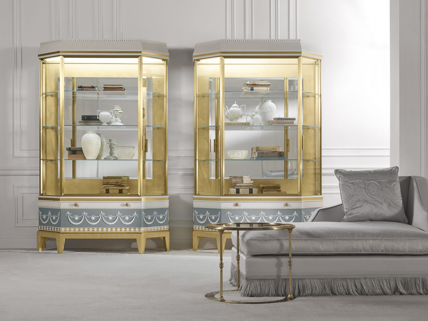 展示多层木板结构和实木异形元素。韦奇伍德陶瓷风格的装饰。白色和灰色漆面,带有饼干瓷器效果和哑光闪亮的金箔。照明系统。