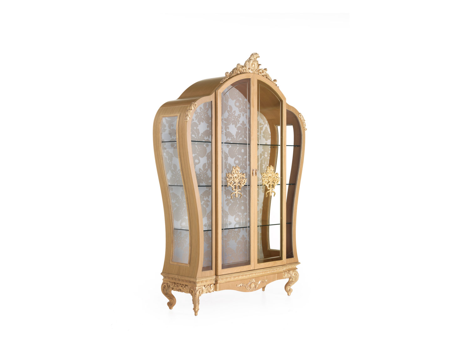 展示,结构采用多层木材,浅橡木和金色饰面。玻璃门。背面采用织物软垫。
