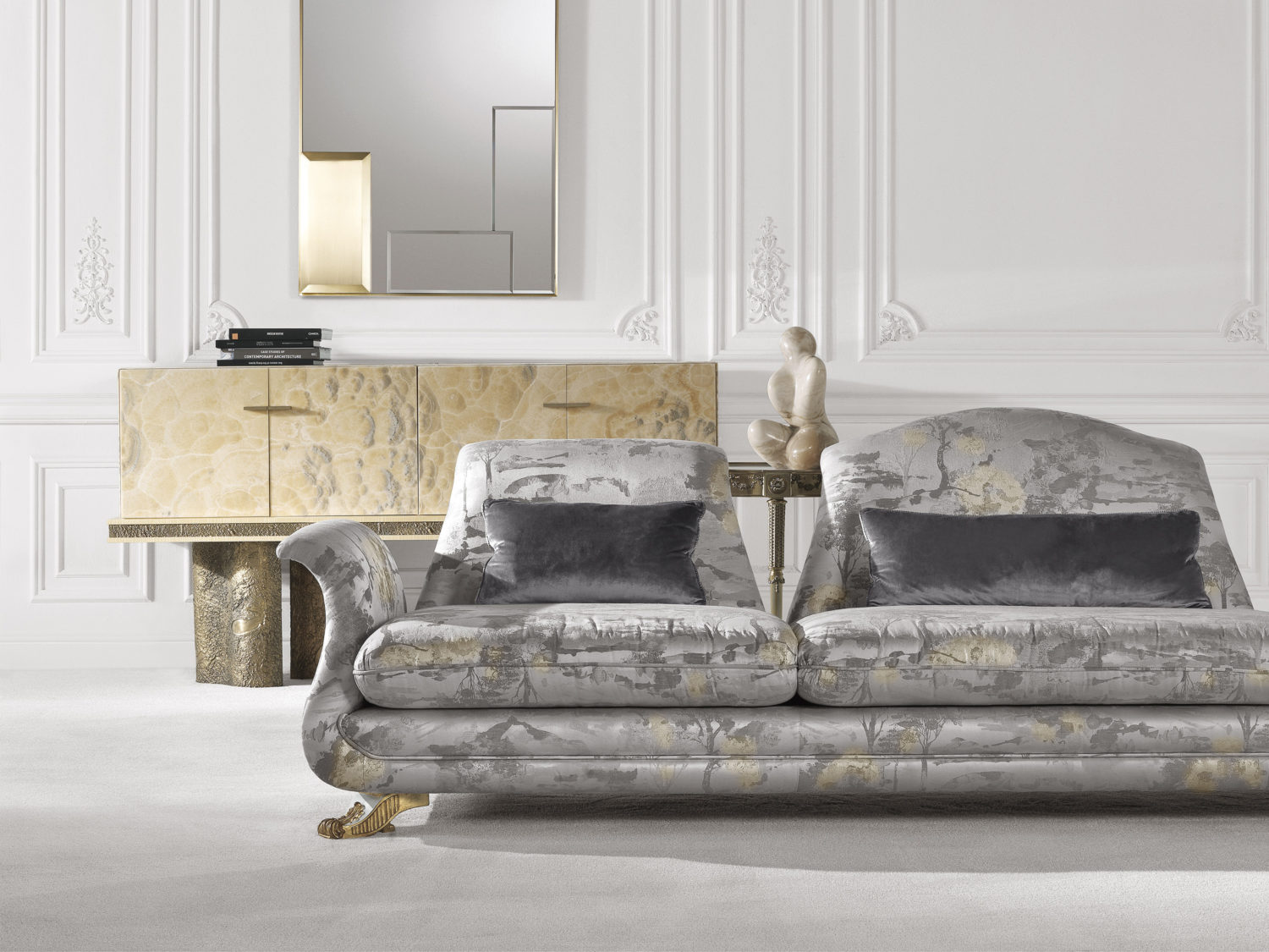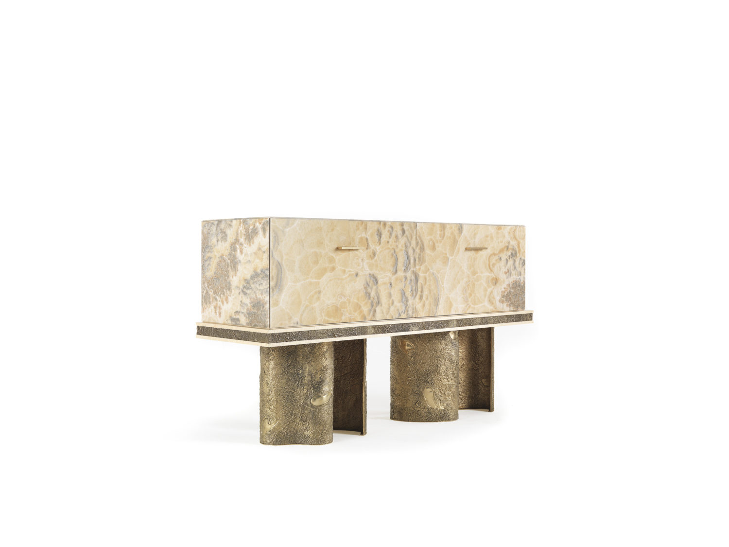 餐具柜,木质结构,覆盖着浑浊的缟玛瑙。雕塑底座,采用失蜡铸造黄铜制成,饰有古董青铜饰面。