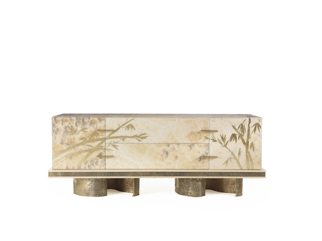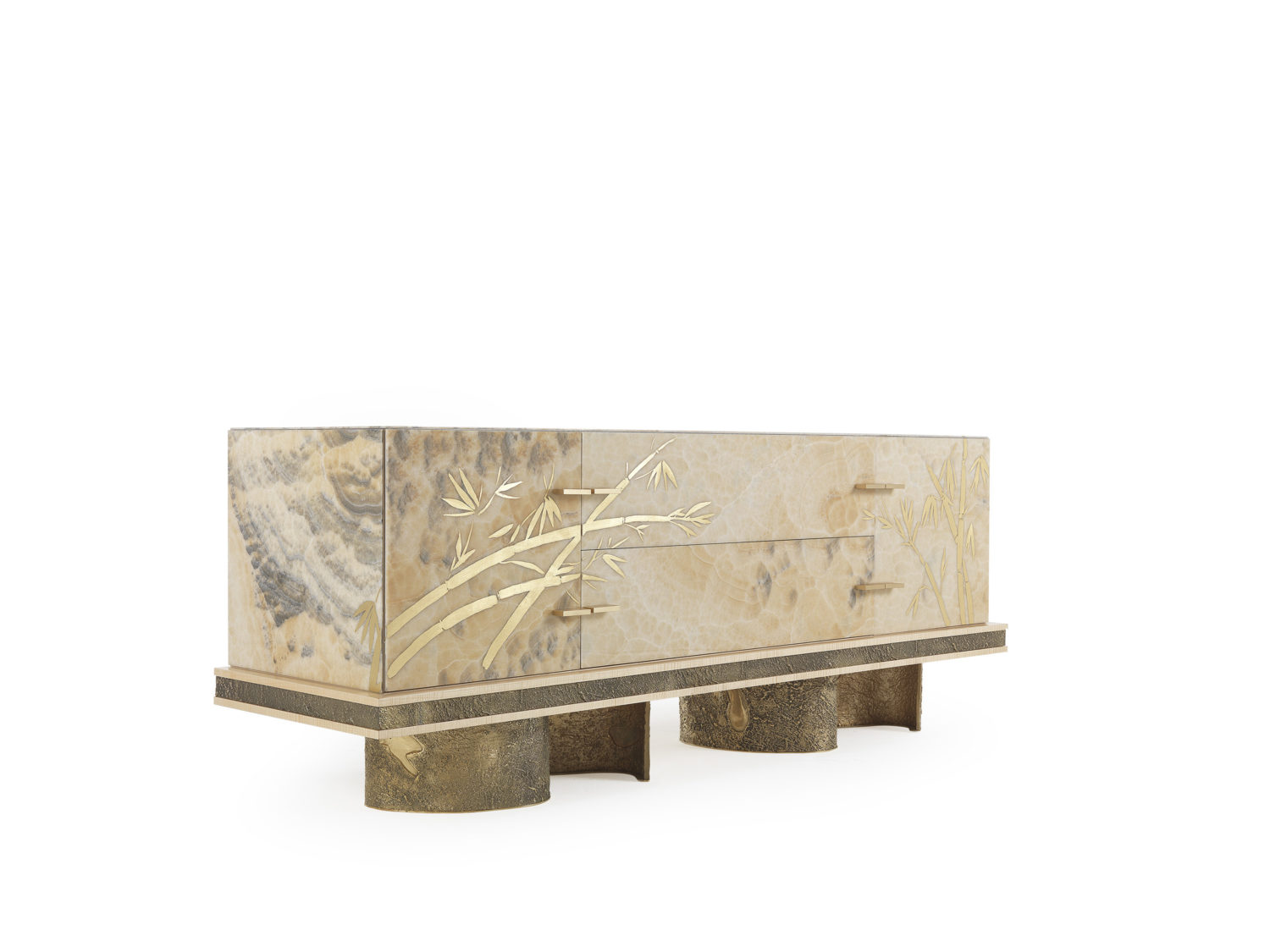 电视架采用木质结构,覆盖着带有金箔装饰的浑浊缟玛瑙。雕塑底座,采用失蜡铸造黄铜制成,饰有古董青铜饰面。