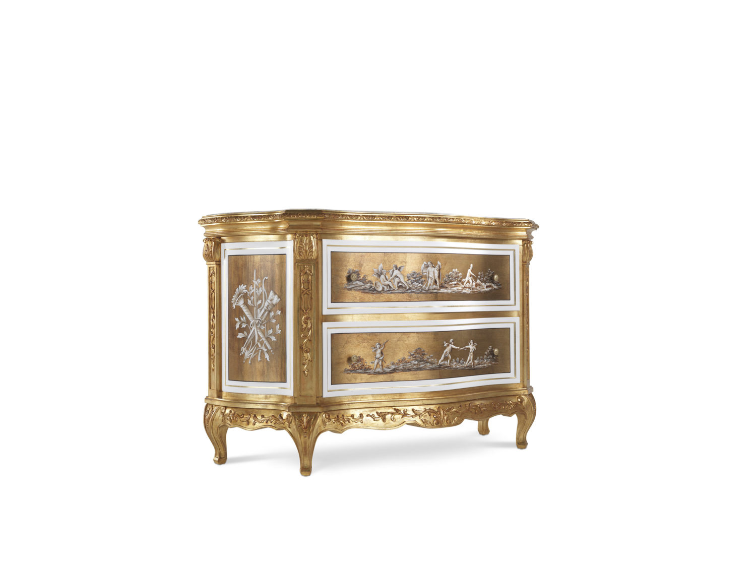 巴洛克风格的五斗柜,采用山毛榉木结构,低浮雕,以古董金箔饰有白色和金色装饰。在浑浊的玛瑙中顶部。