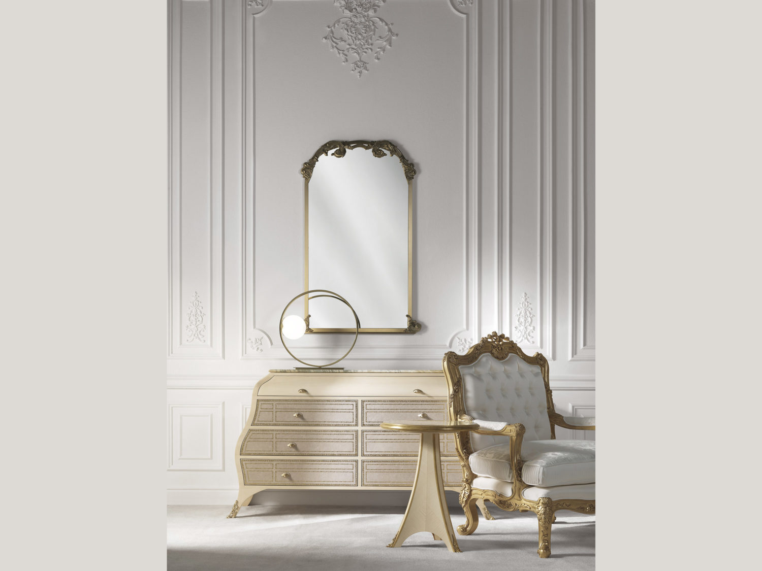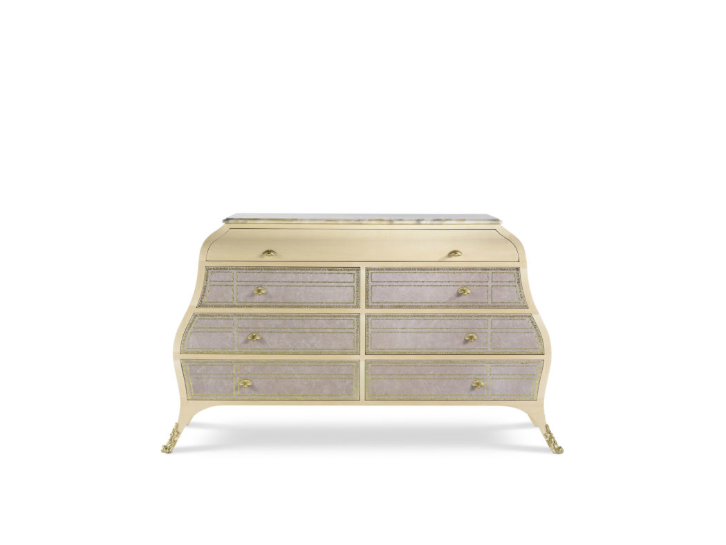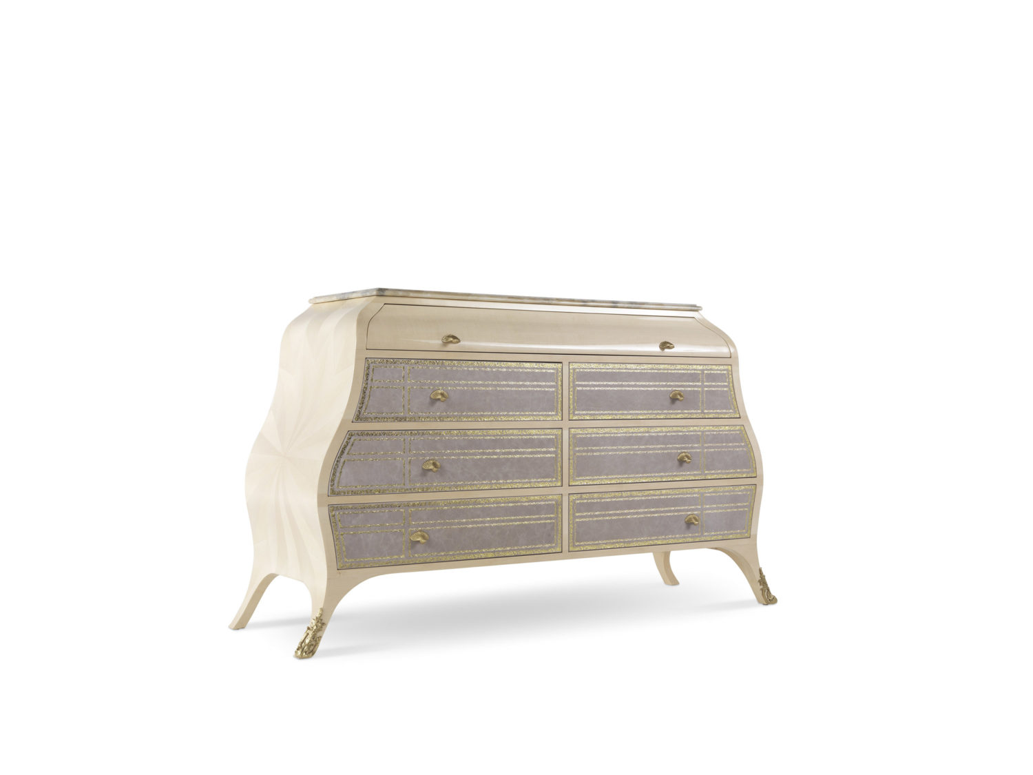 多层枫木结构的抽屉柜。抽屉前部采用皮革装饰,饰有金色装饰。软壳面料形状的手柄和脚尖采用手工凿铸的黄铜制成。在浑浊的玛瑙中顶部。