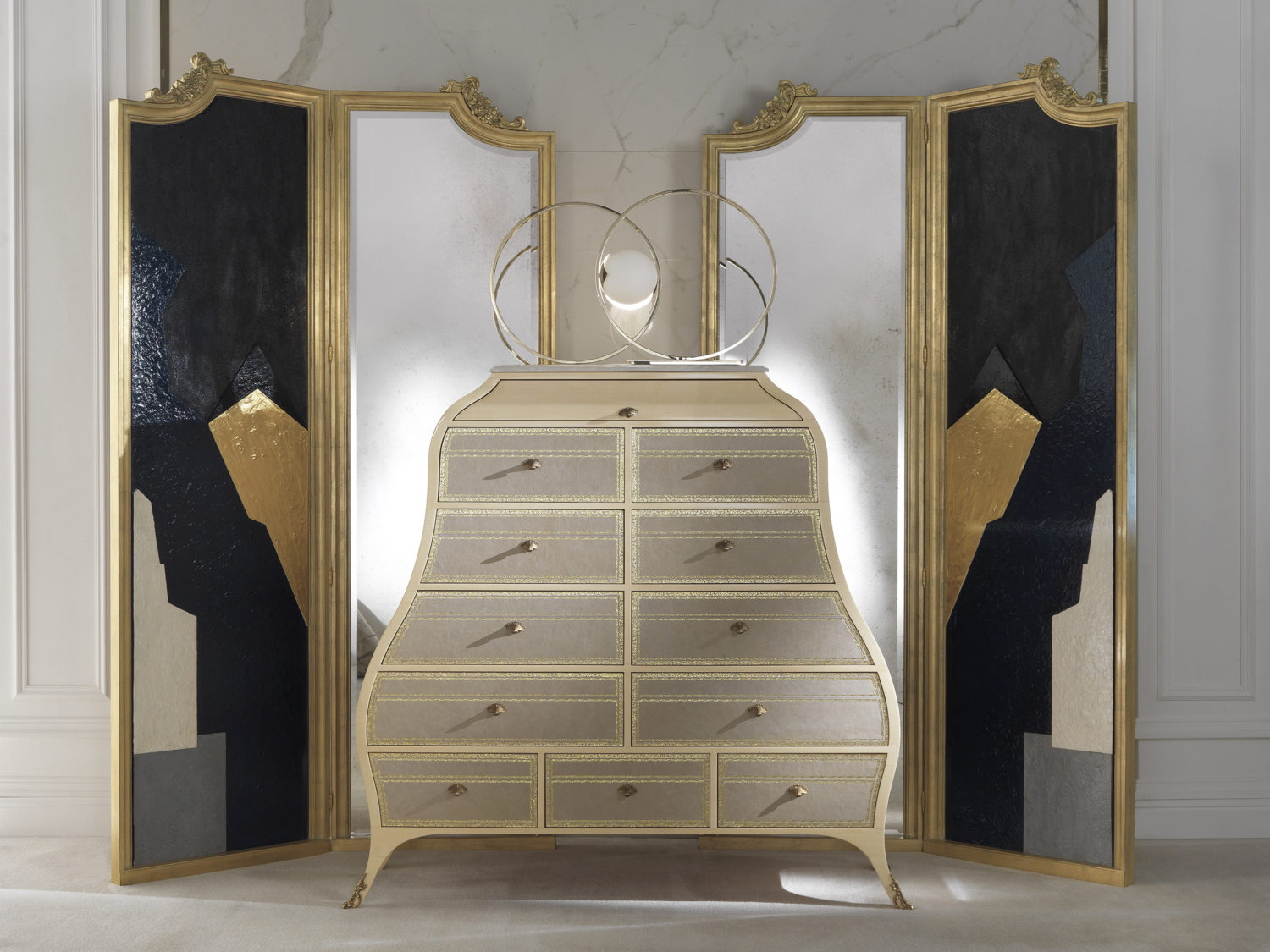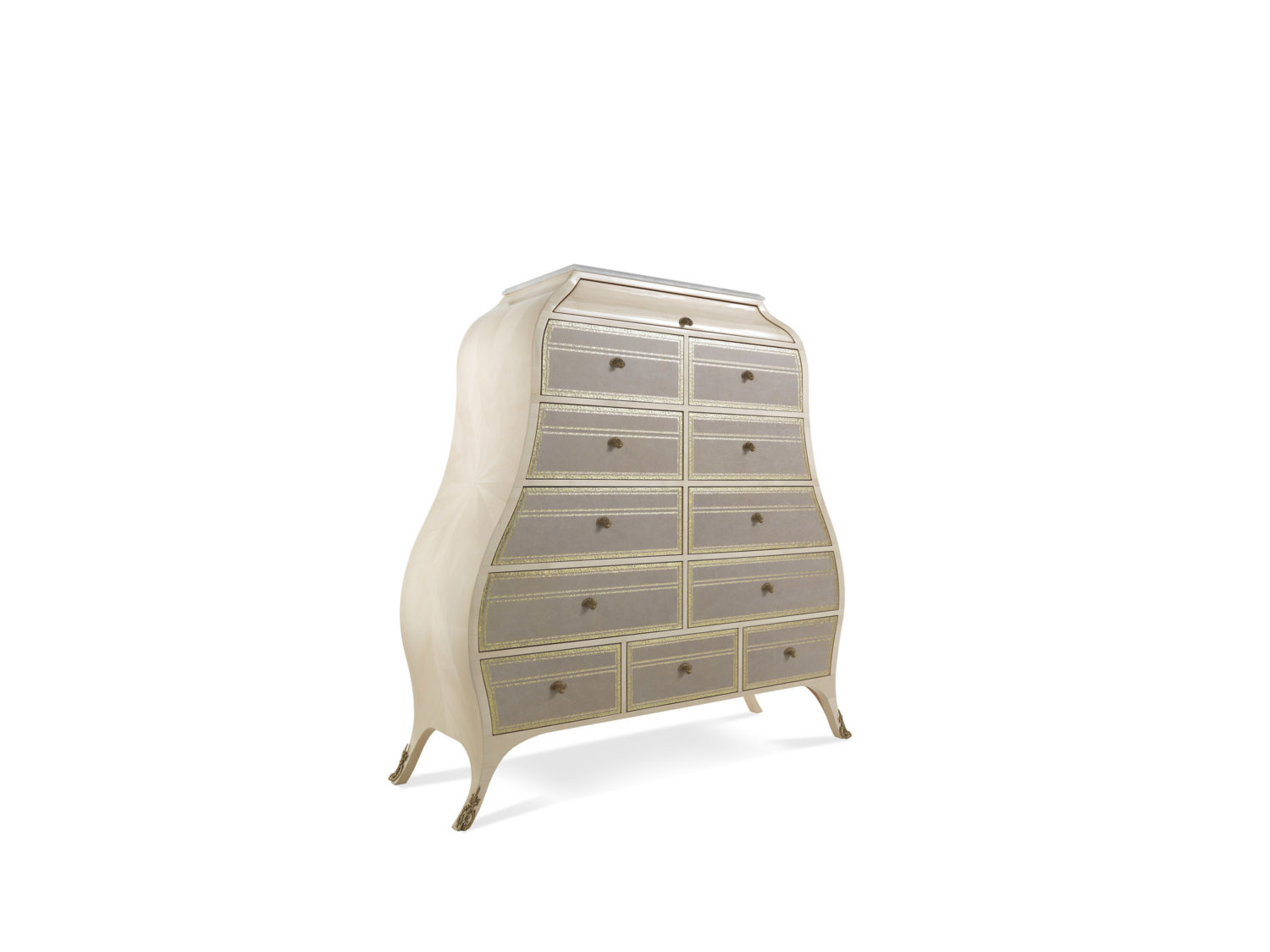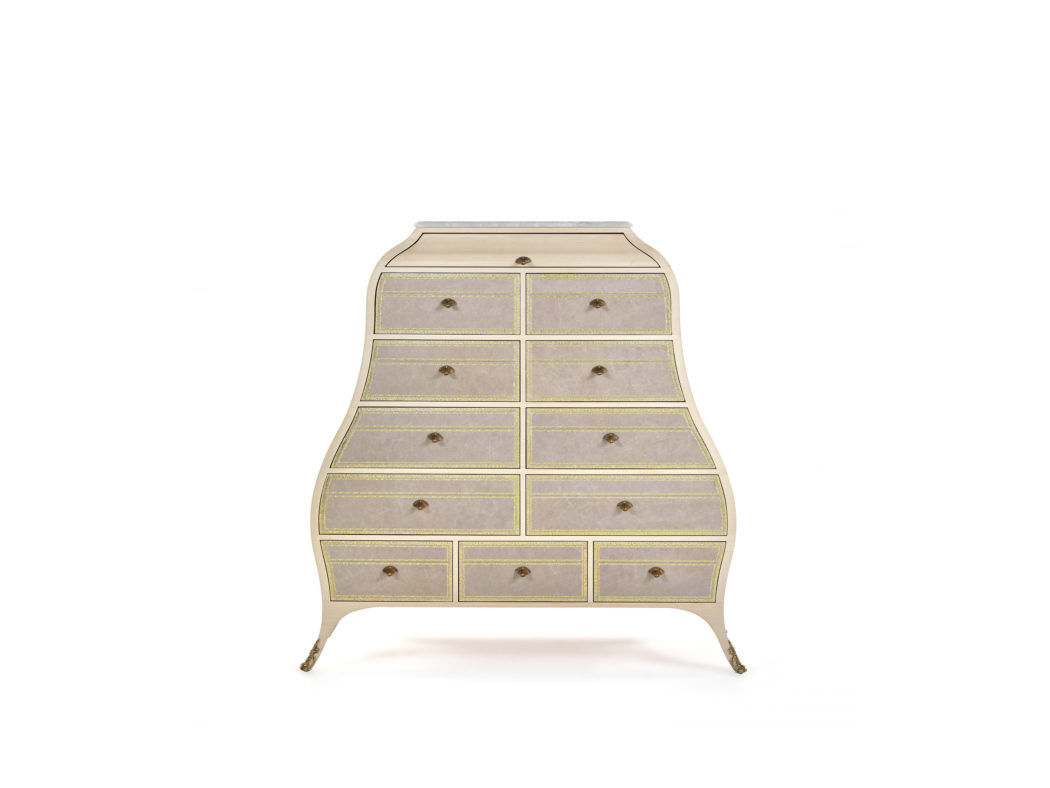 多层枫木结构的抽屉柜。抽屉前部采用皮革装饰,饰有金色装饰。软壳面料形状的手柄和脚尖采用手工凿铸的黄铜制成。顶部是白色纳米比亚犀牛大理石。